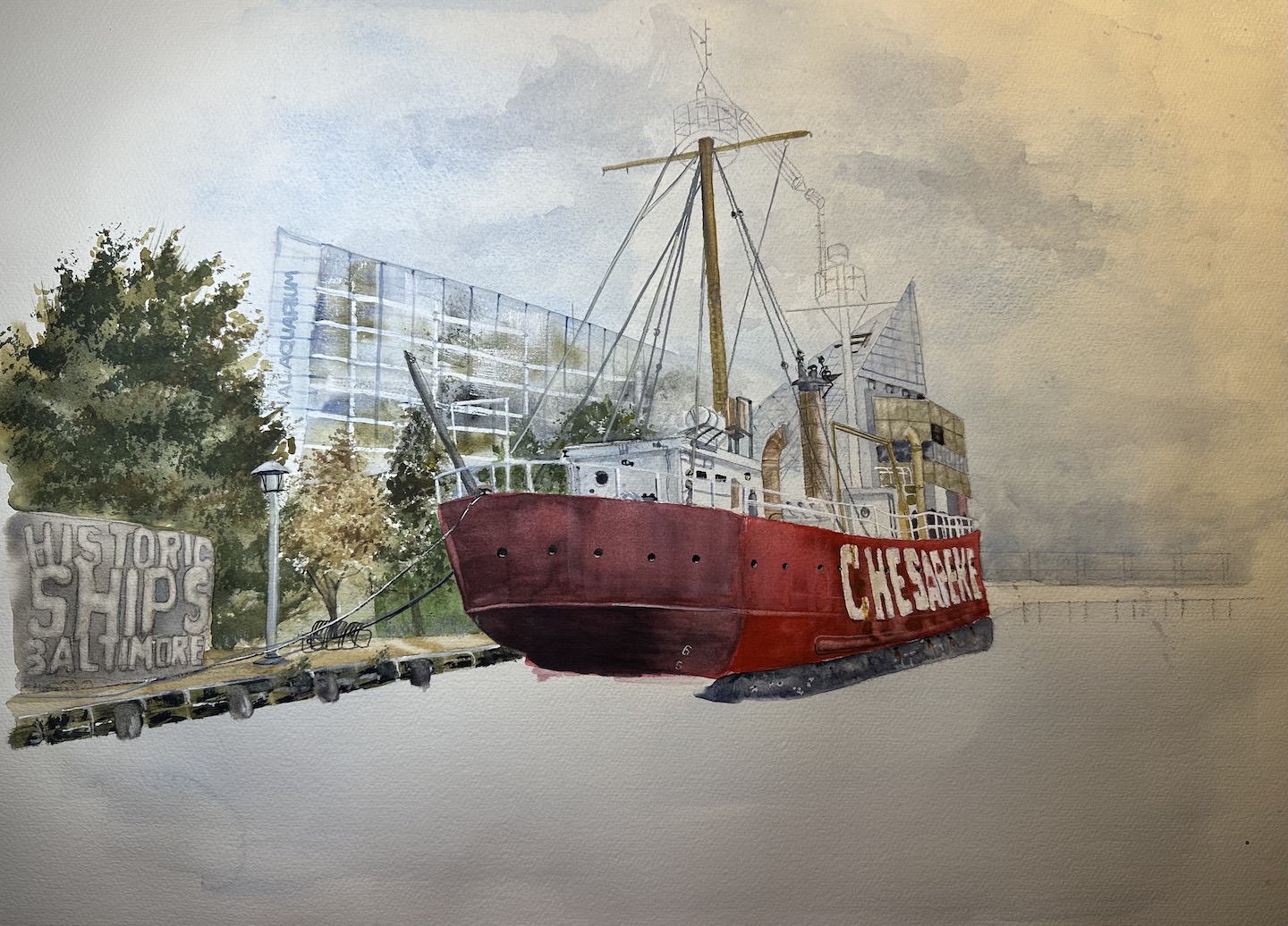 I love the majesty of the Chesapeake, with its beautiful bright red color, its rigging, and shear size. I debated including the aquarium in this piece, but the interesting shapes of it was a nice comparison to the form of the ship. I’ve subdued it a bit, and added some more trees to set it apart from the ship.
