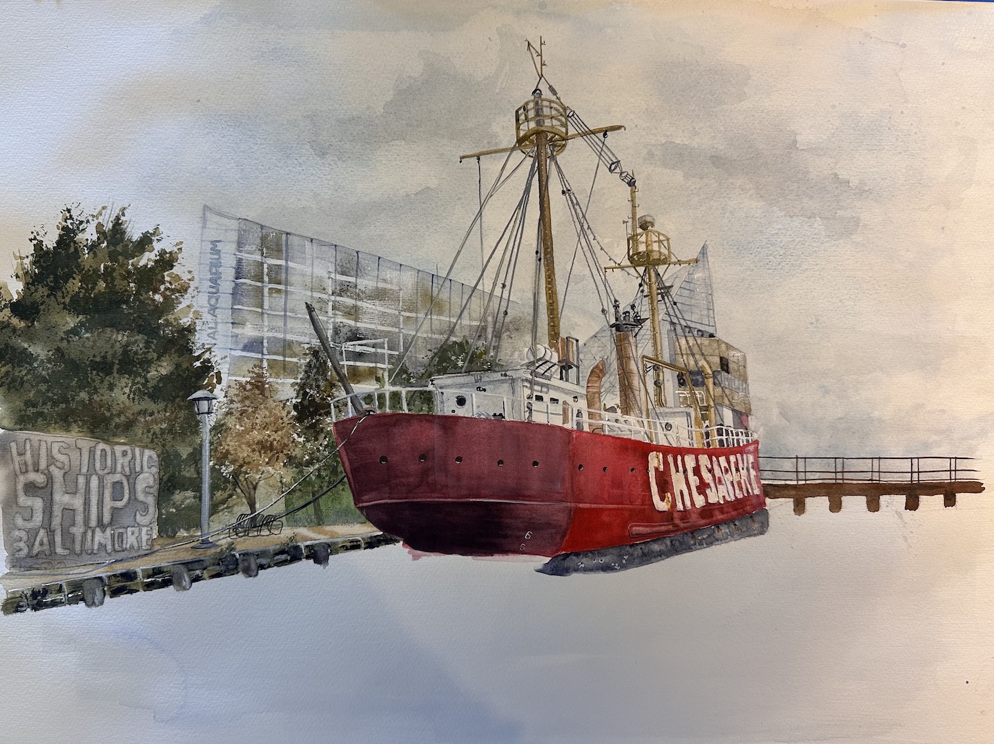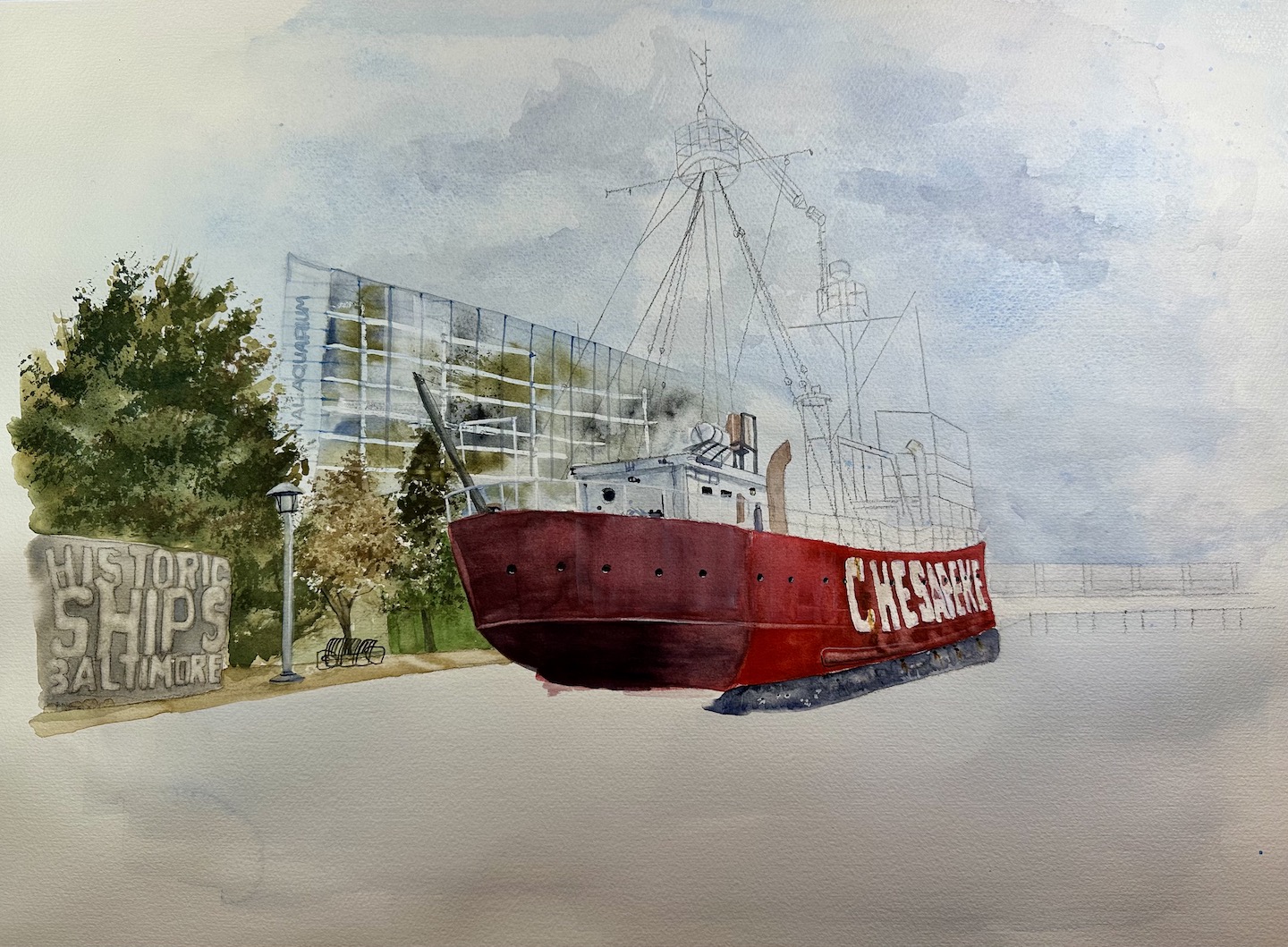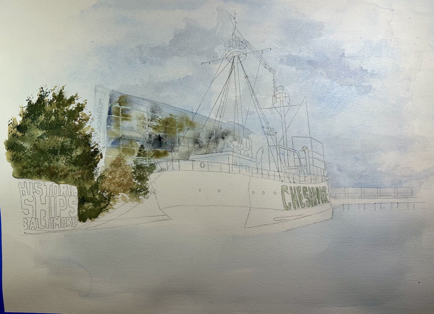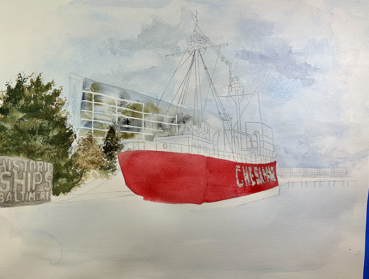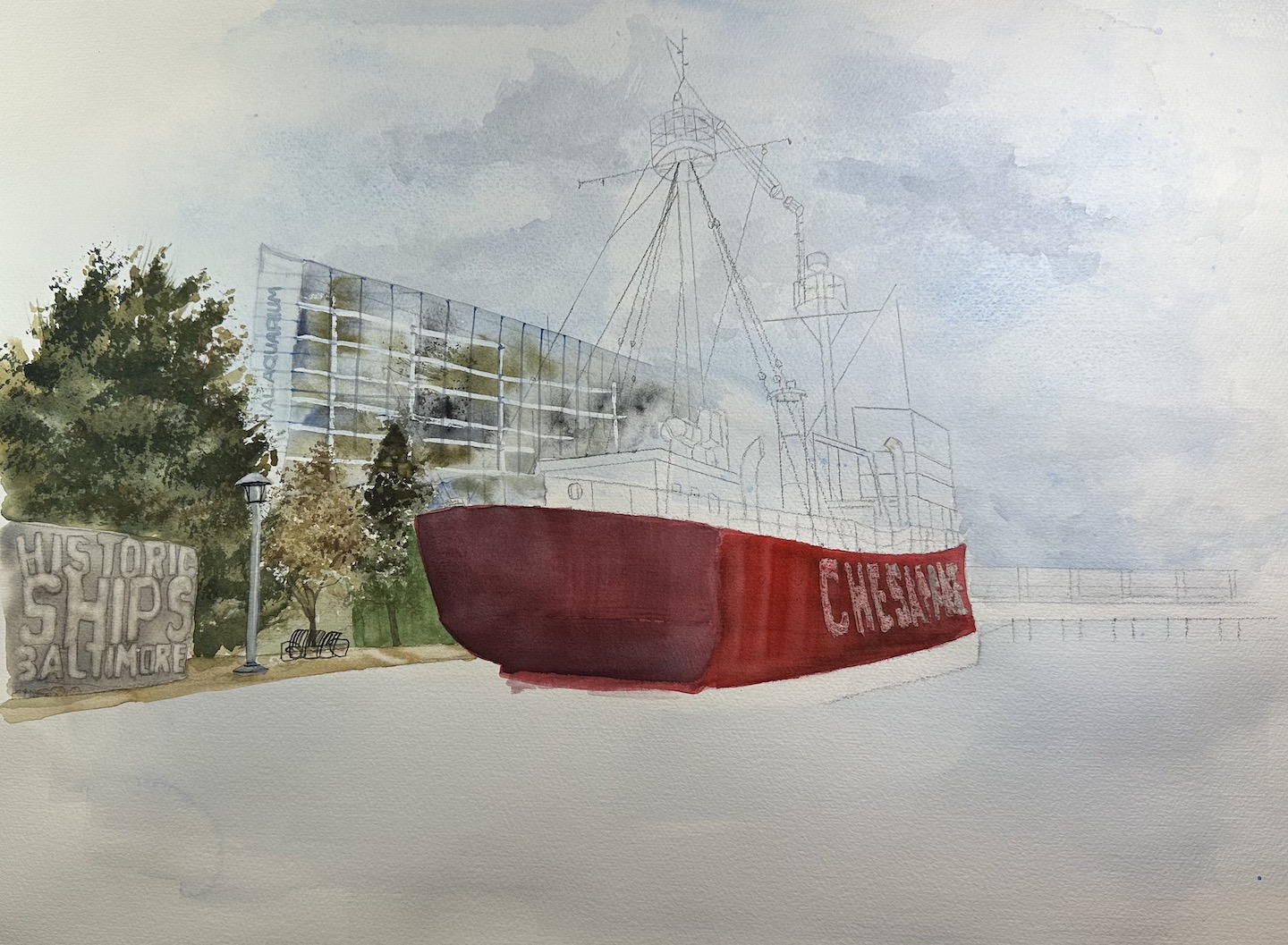 I love the majesty of the Chesapeake, with its beautiful bright red color, its rigging, and shear size. I debated including the aquarium in this piece, but the interesting shapes of it was a nice comparison to the form of the ship. I’ve subdued it a bit, and added some more trees to set it apart from the ship.